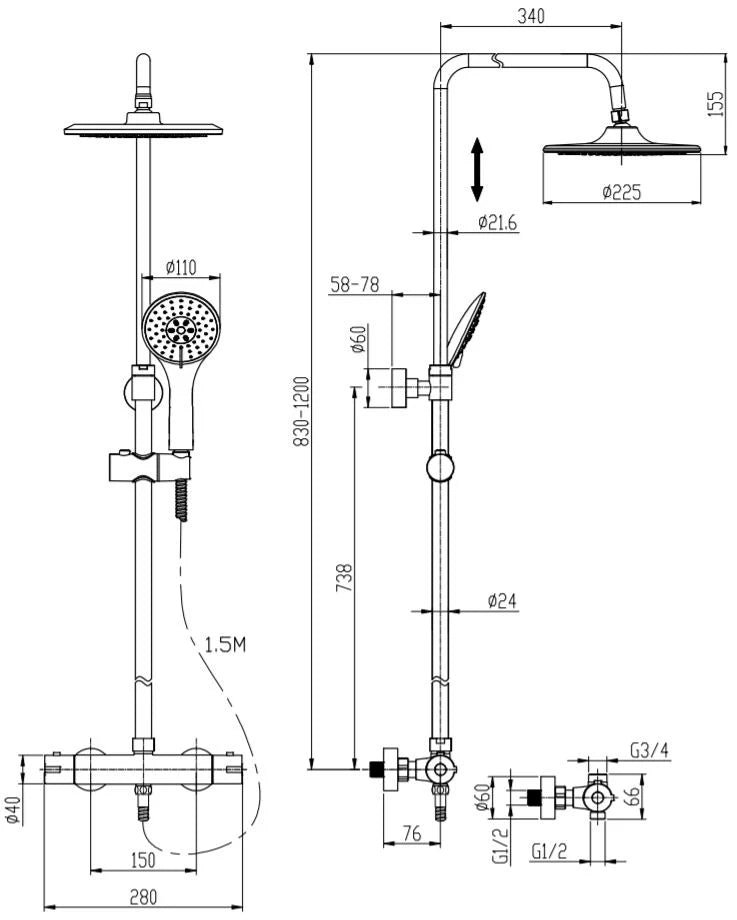 - Shower Top to Bottom Adjustability: 830mm – 1200mm