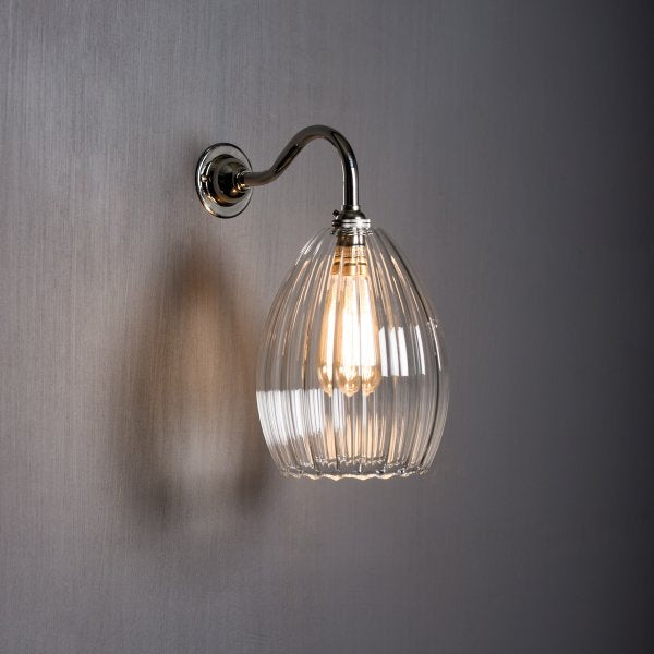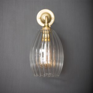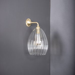 Designed in Britain, MOLLY is a mid-sized, ribbed, hand-blown, transparent glass lampshade with a wall mount. Following several requests from our clients for a larger wall light, we created the mid size wall light, and it is unquestionably a popular option.