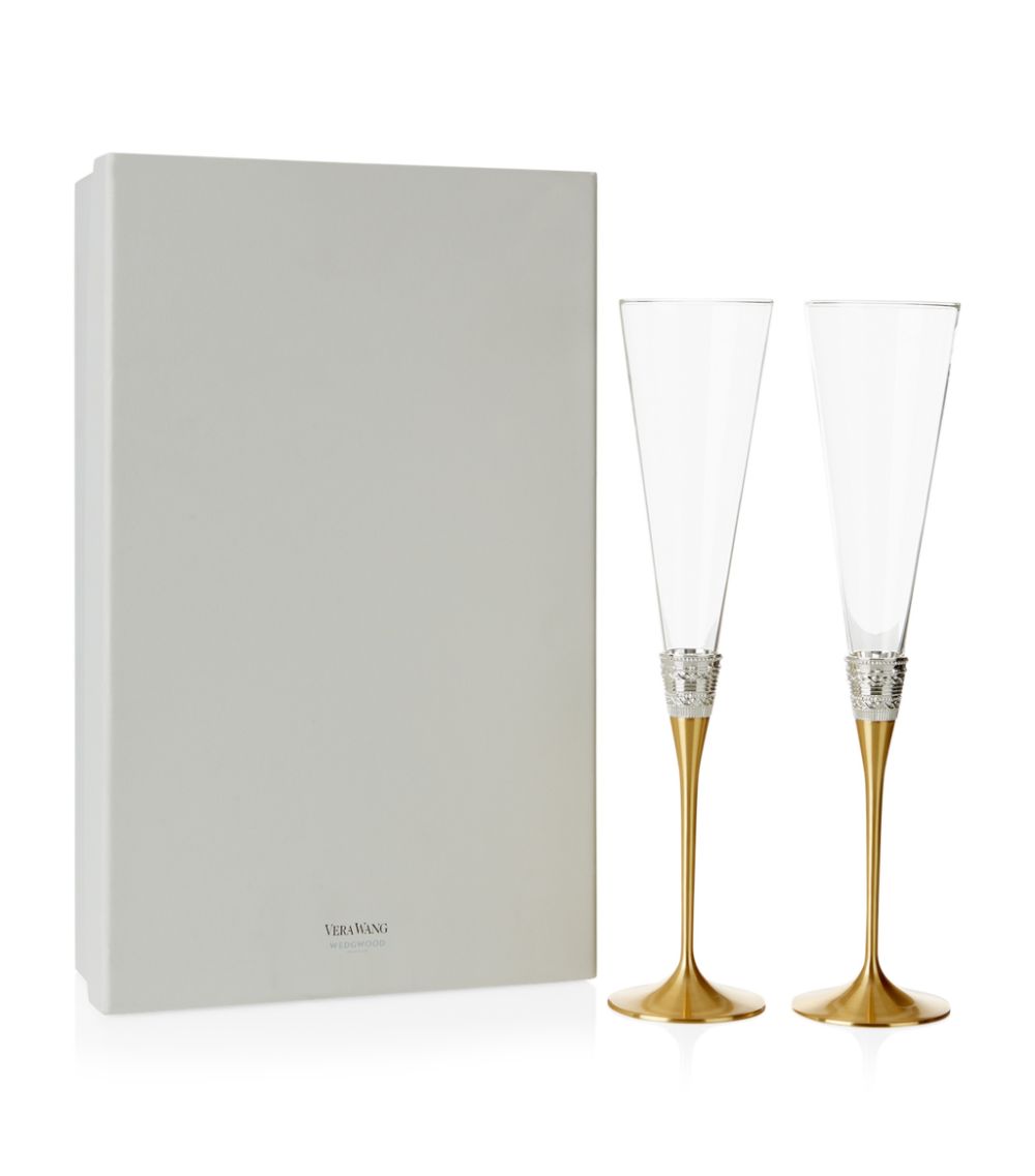 These lovely With Love Toasting Flutes from the Vera Wang for WEDGWOOD collaboration elegantly express the eternities of love, taking design cues from interlocking rings. They are made of crystal and have a sophisticated tall shape. A gold-plated stem and silver embossed pattern decoration in the centre enhance them. They are a lavish celebration of love and dedication and would make a lovely wedding or anniversary present.